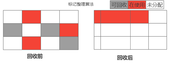 标记整理压缩算法是一种移动式的算法,由于上面标记清除算法导致内存不连续的问题 标记-整理算法就解决了这个问题。