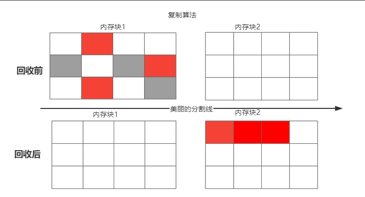 复制算法更粗暴了,逻辑也很简单 通常直接申明了2块一样大小存储空间,每次只使用其中1块空间,当使用的这块空间不够用的时候就触发回收操作,将存活的对象copy到另一块空间中按顺序存放,可回收的就回收删除掉,这样一来就不会出现内存碎片,但是要多浪费50%的内存空间,主要用于年轻代 比如s0 s1亦是如此。