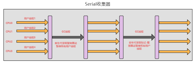 serial回收器是一个串行单线程回收器,在进行垃圾回收的时候必须暂停用户工作线程,直到回收线程处理完成,每次回收必然会STW。比较适合跑在client端应用