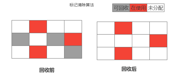 标记清除算法是一种非移动式的回收算法,分为标记 清除 2个阶段,简而言之就是先标记出需要回收的对象,标记完成后再回收掉所有标记的内存对象,如下图