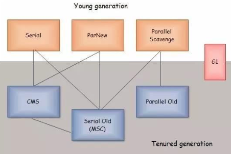 上面的垃圾算法仅仅只是一个理论上的算法 ,正在实现这些算法的叫垃圾回收器,在工作中具体是怎么回收工作的可以不关心,但是需要了解不同的垃圾回收器是基于哪种算法实现的,有助于出现性能问题的时候有思路去参数调优,而不是盲目的问度娘。各个年轻代 老年代垃圾回收器可组合配对方式如下图所示