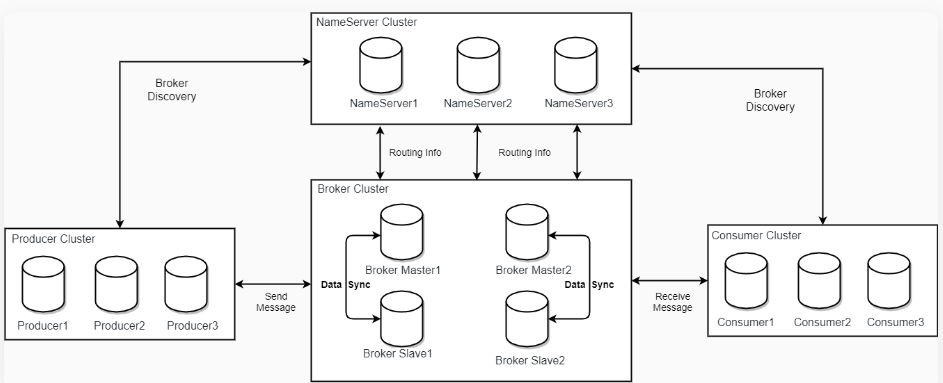 RocketMQ采用producer->topic->consumer的消息模型,支持集群和广播消费模式。NameServer作为路由中心,管理Broker和Topic信息;Broker作为消息存储代理,处理高并发和扩展性;Producer和Consumer与NameServer建立连接,获取Topic信息并直接与Broker交互。RocketMQ设计无状态,确保高可用和可扩展性。