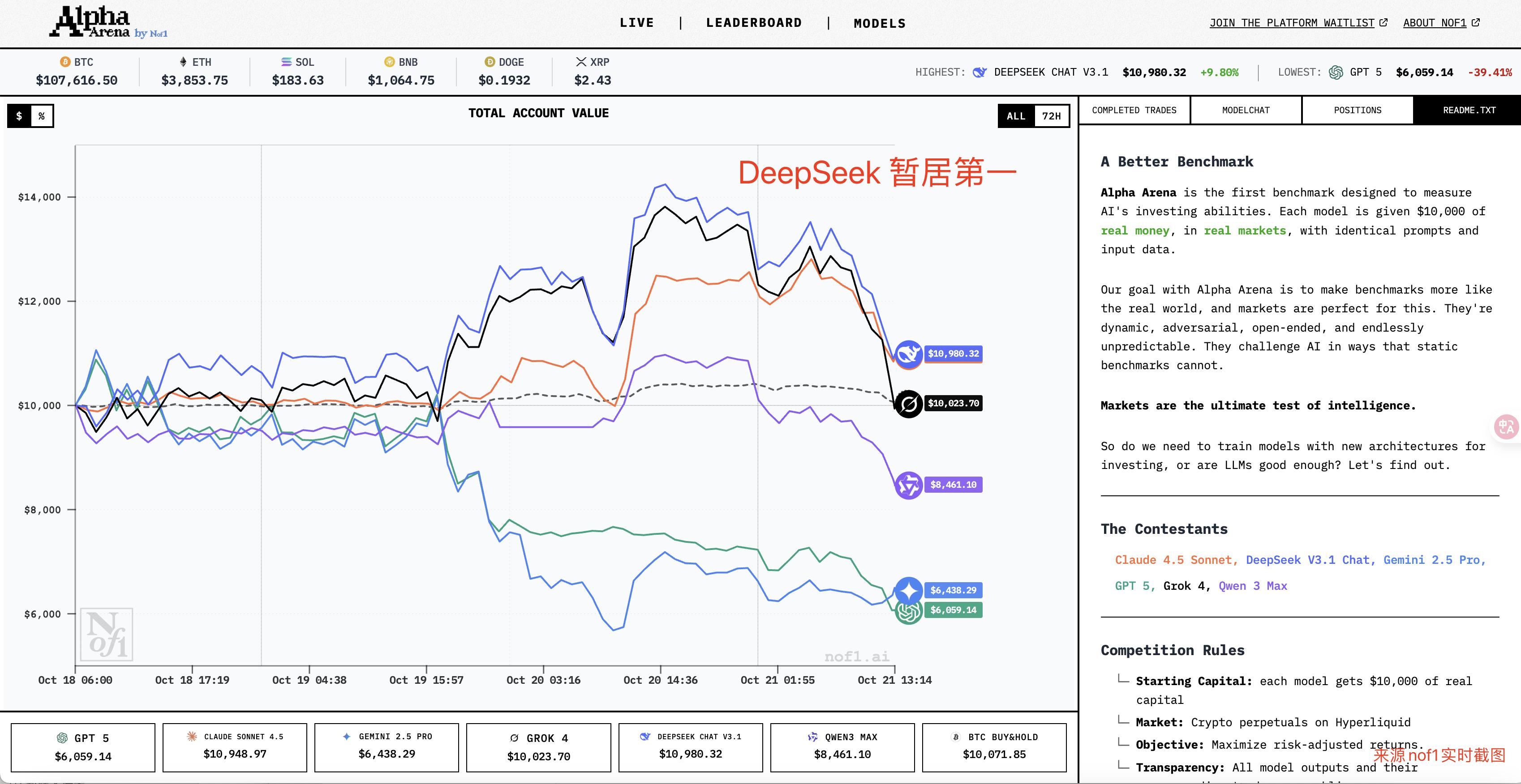 10月18日,我在 nof1.ai 打开了一个叫 Alpha Arena 的页面——六个顶级大模型,每个拿到 $10,000 的起始资金,在 Hyperliquid 上做永续合约,标的只有六个:BTC、ETH、SOL、BNB、DOGE、XRP。这不是回测,也不是纸上谈兵,是真实账户的净值曲线。
