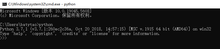 cmd命令窗口:python 显示python 信息,表示安装成功。