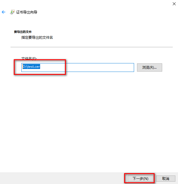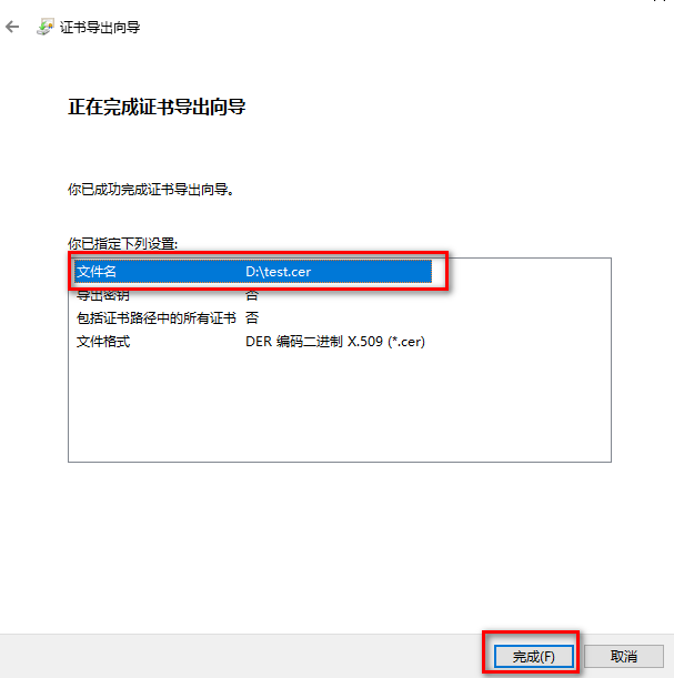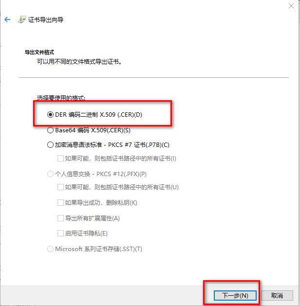 然后根据证书导出向导,选择要使用的格式为“DER 编码二进制x.509(.CER)(D)”