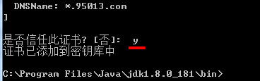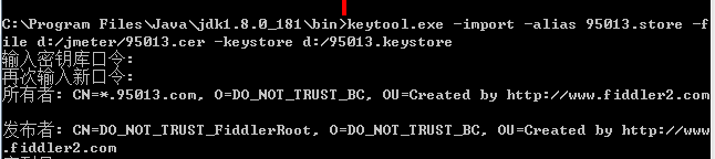 输入命令:keytool.exe -import -alias 95013.store -file d:/jmeter/95013.cer -keystore d:/95013.keystore