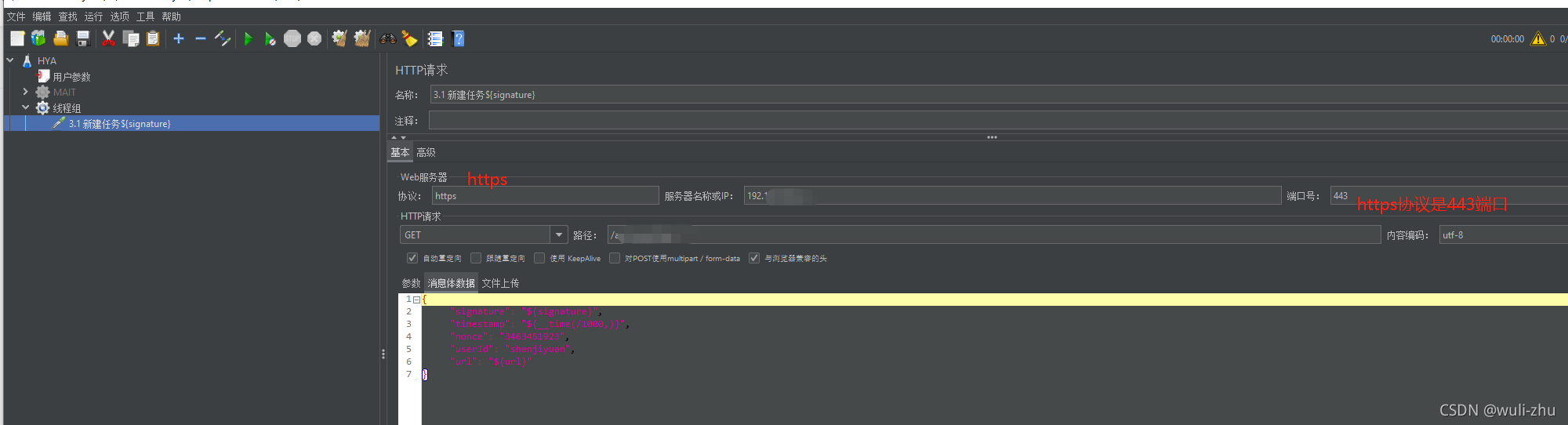 1、jmeter中新建https请求,要注意,是https协议、443端口;