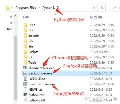这里给出各浏览器(Chrome、Firefox、Edge等)的驱动下载地址,自行下载所需浏览器驱动。 - 将下载好的浏览器驱动放置在Python安装目录下(即Python环境变量配置目录)