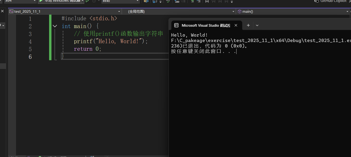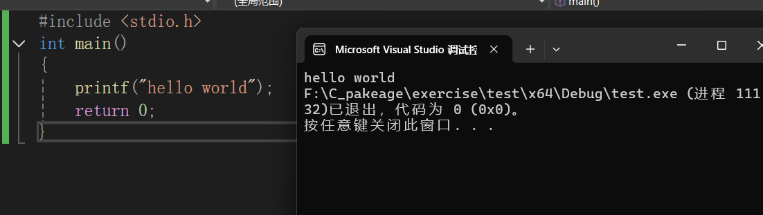 ⑪最后我们可以输入我们的第一个打印hello world的代码测试(按ctrl+F5运行)VS 2022是否可以正常使用