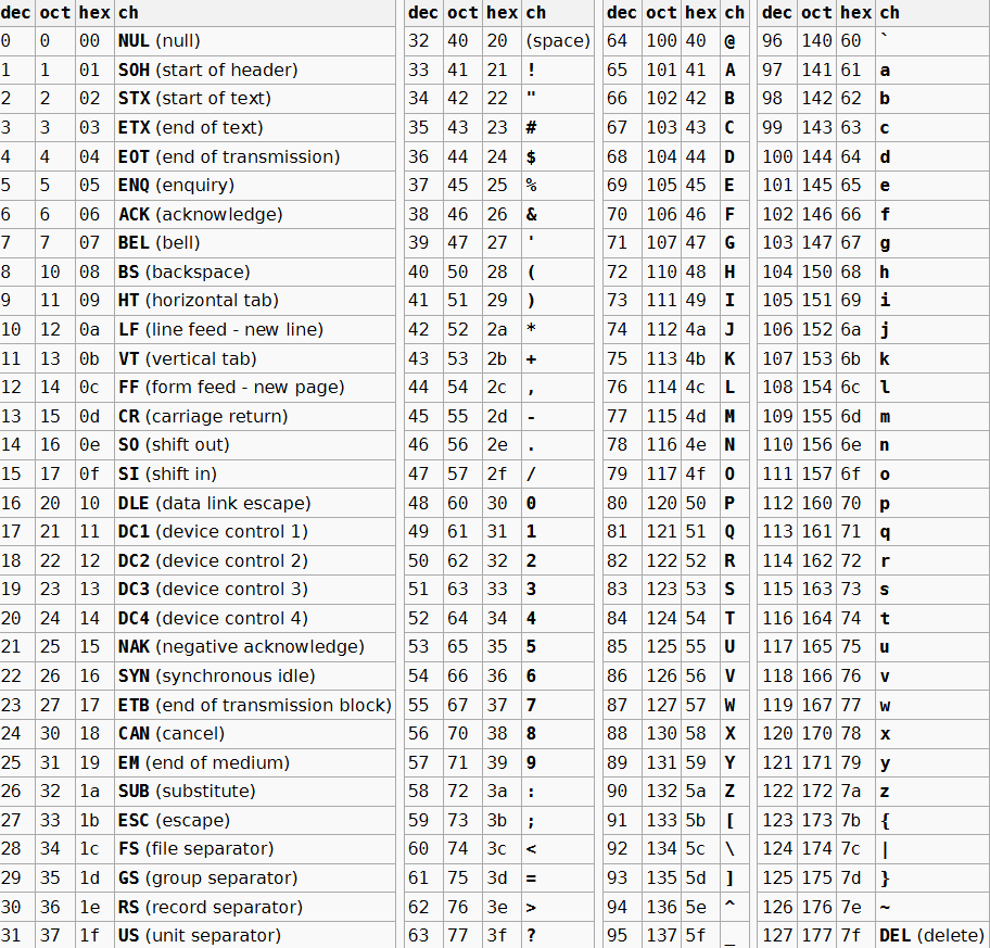 我们大概需要知道:A~Z从65到90,a~z从97到122,(大小写差值为32,例:A是65那么a是97),0~9从48到57,\n(换行符)的值是10,0~31这32个字符无法打印出来在屏幕上观察。