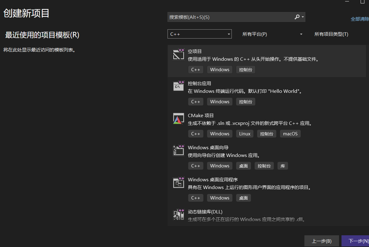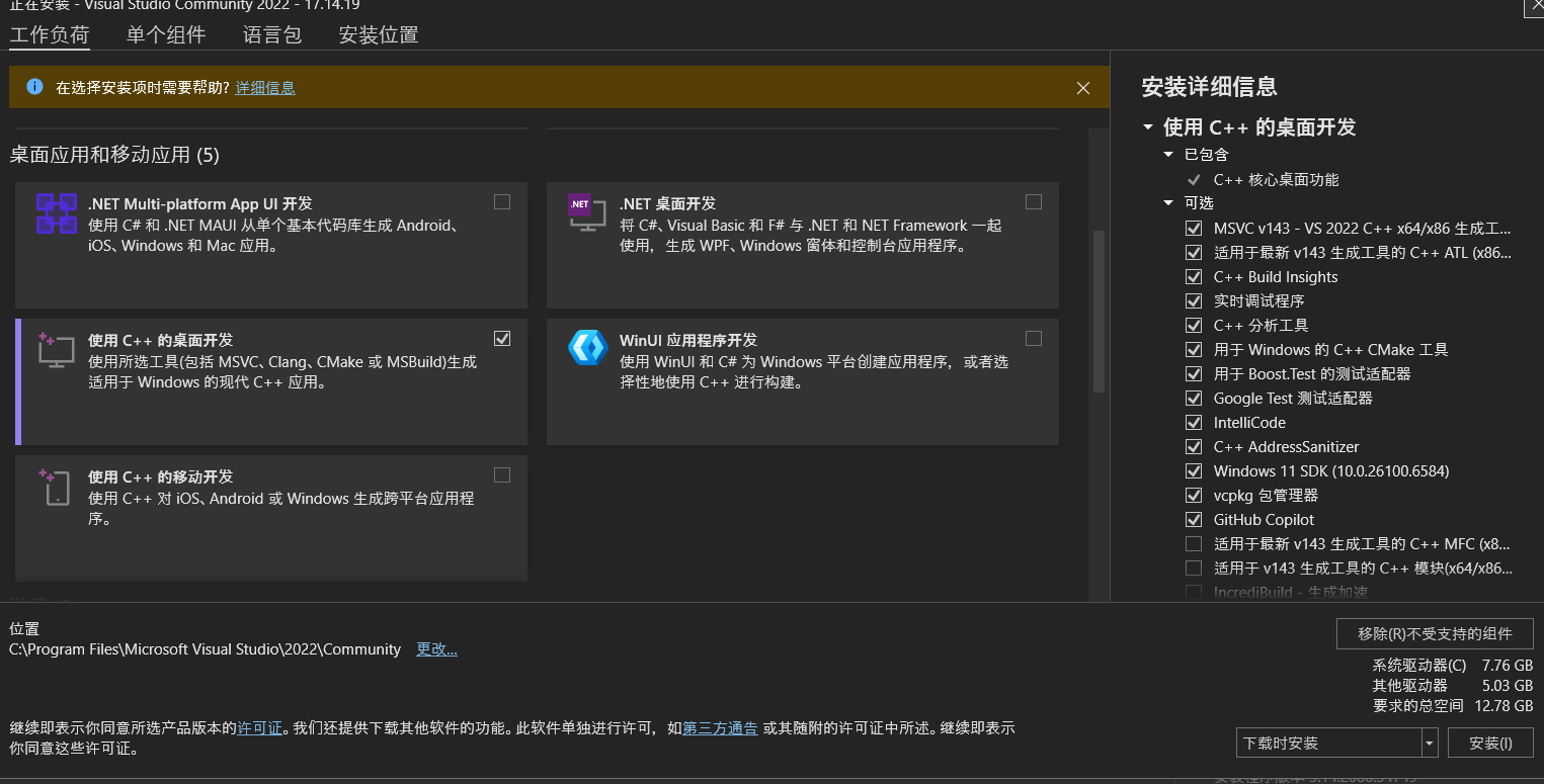 ③勾选使用c++的桌面开发