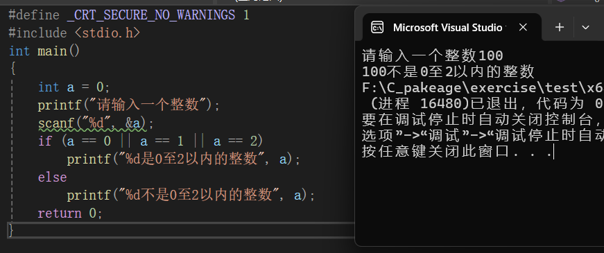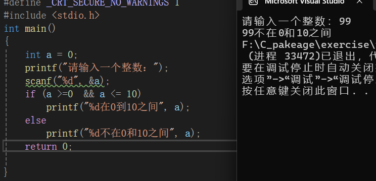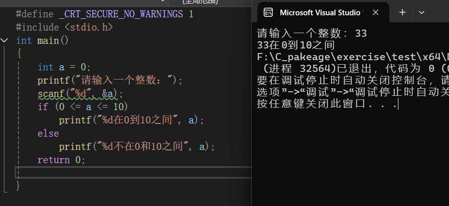 这是我们正确的代码,假如你想当然的把a >= 0 && a<=10换成0<=a<=10,会发生什么,我们来看下面代码的运行。