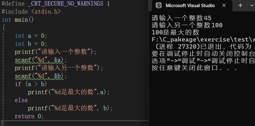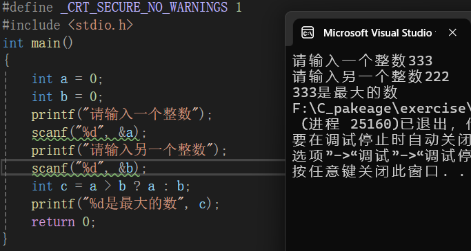 这种形式的就叫做条件操作符,由于他有三个操作数,所以也可以叫做三目操作符。该操作符的意思是我的表达式1成立时,执行表达式2,否则执行表达式3,它在一些情况下,可以代替我们的if...else...,下面我们用一个例子来感受一下。(比较两个整数的值,并输出较大的那个数)