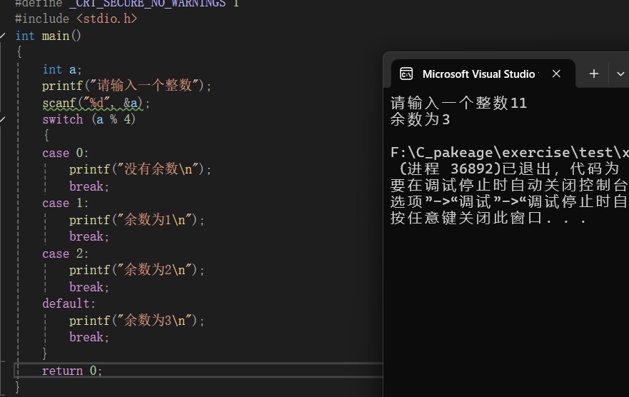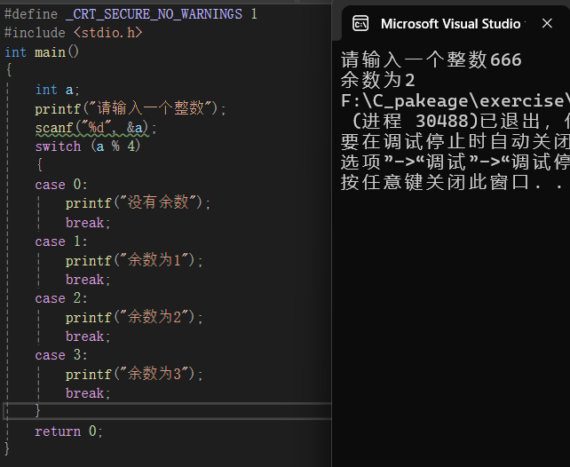 再来看右边这个代码,输入11时,case 0,1,2都不满足,所以最后就执行default输出了余数是3。