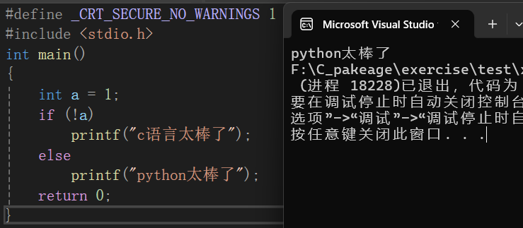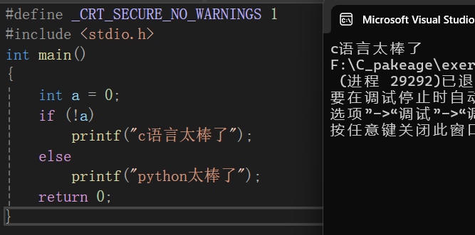 我们先看右边的代码,a的值是0为假,那么!a就为真,所以它的输出结果就是“c语言太棒了”。再看右边的代码,a的值为真,那么!a的值就为假,所以输出结果为“python太棒了”。