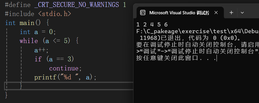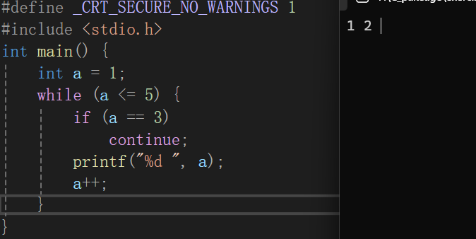 先看左边的代码我们明明使用了comtinue,为什么却没有达到我们预期的效果。下来我们分析一下,当你的a等于3时,会跳过后面两条语句,这样你的a值一直都是3,所以它陷入了死循环。再来看右边的正确代码,把a++放到continue的上面,这样它就不会被迫跳出了,你的a值才会发生改变。