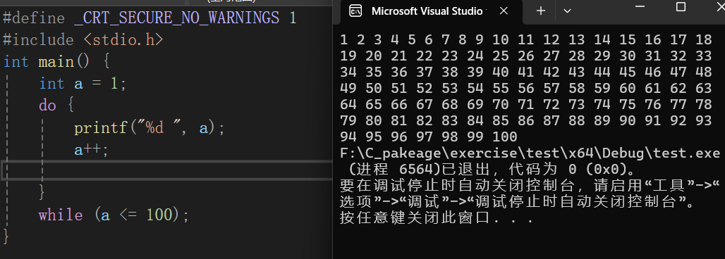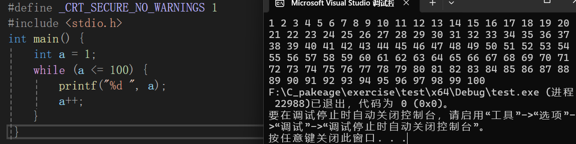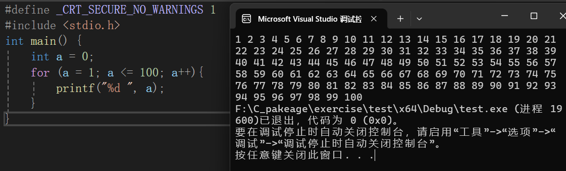 我们前面用while循环演示了从1打印到100,现在我们用for循环试试: