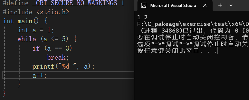 比如我们想要在屏幕上打印1-5,但是遇到3就立马停下,就可以使用break。