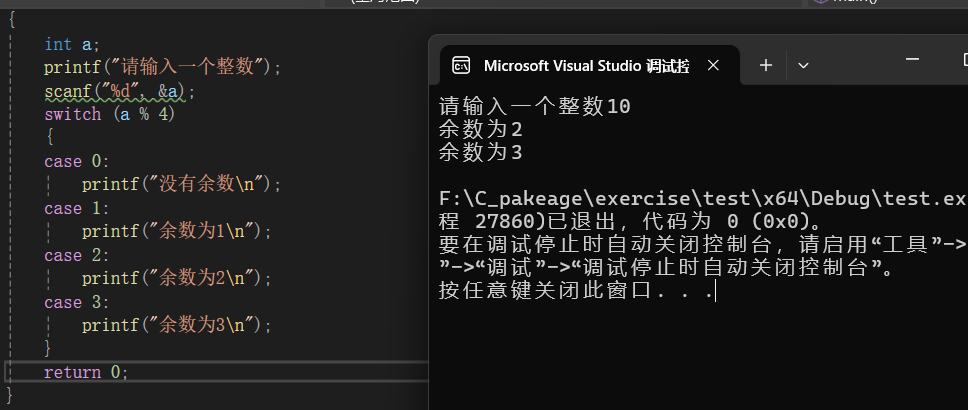 通过左边这个代码我们明显产生了一个疑问,为什么我输入了10本来最终我的余数是2,为什么却打印出了我的余数是2和3,这是因为你没有break,我们来刨析一下这段代码是怎么运行的余数为2时就进入了case 2那么在没有break的情况下它后面的语句都会执行。