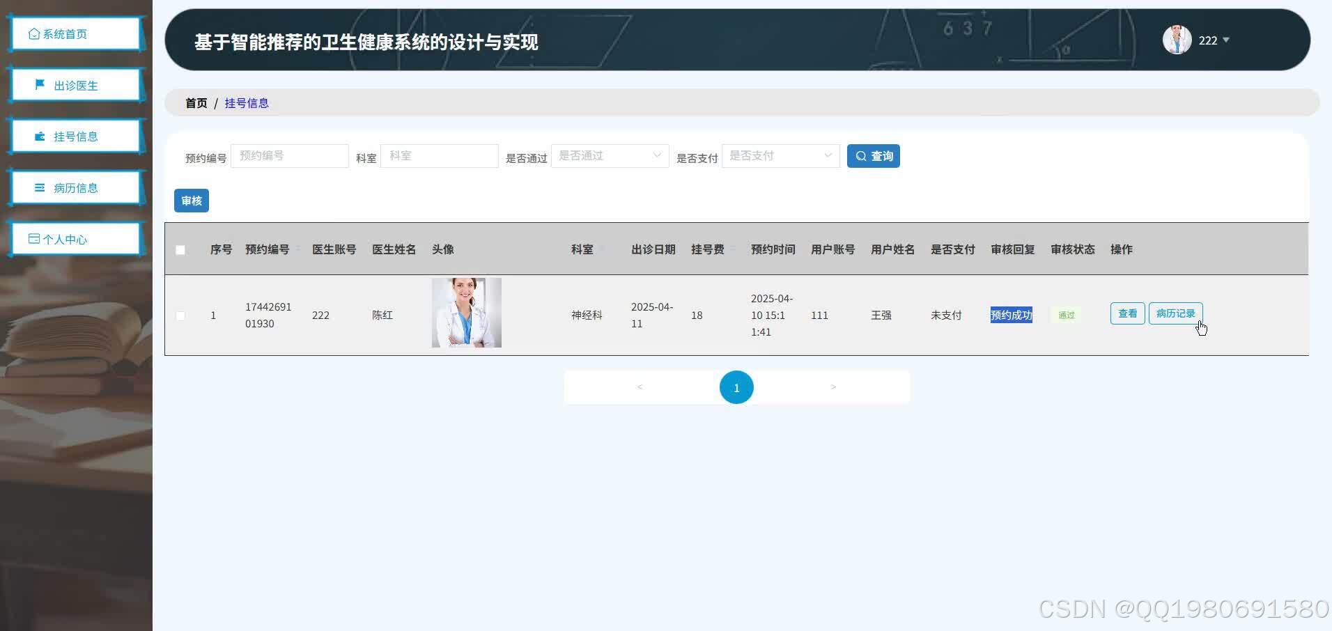 本课题旨在设计实现基于SpringBoot+Vue的智能推荐卫生健康系统,核心是整合健康知识资源、用户健康档案、体检数据、诊疗记录、养生方案、医疗服务机构及用户偏好等全流程数据资源,涵盖健康科普文章、疾病预防知识、体检报告指标、诊疗建议、养生食谱、运动方案、医疗机构信息、用户健康画像及服务评价反馈等关键信息,以SpringBoot为后端核心开发框架,结合MyBatis、Redis等技术实现数据的高效存储、查询与缓存,搭配Vue构建前端交互界面,搭建集健康知识推送、个性化健康方案推荐、健康数据管理、医疗服务查询、数据统计分析于一体的智能卫生健康综合服务平台。系统支持平台运营团队、医疗服务人员及广大用户,按健康问题类型、年龄阶段、身体状况、兴趣偏好等多维度灵活筛选查询与操作,实现健康知识智能推送、个性化养生/运动方案自动生成、用户健康数据实时追踪、医疗服务精准匹配及健康数据可视化分析,突破传统卫生健康服务中信息获取零散、健康方案适配度低、个人健康管理不便、医疗资源对接不精准的局限性,可清晰呈现热门健康话题热度、用户健康需求偏好、服务使用趋势及平台运营过程中的潜在问题。该系统既能为卫生健康领域拓宽服务渠道、提升服务效率、强化精准服务能力提供技术支撑,也能满足用户便捷获取个性化健康服务、科学管理自身健康的需求,助力卫生健康领域数字化服务体系完善,推动卫生健康服务向高效化、规范化、智能化方向发展。