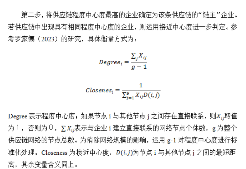 01、数据简介上市公司链主是指处于产业链供应链核心优势地位的上市公司,在产业链中占据主导地位,对产业链资源配置、技术产品创新、产业生态构建及价值实现具有重大影响力,并肩负提升产业链整体绩效的核心企业。“链主”企业作为供应链核心,需要发挥引领作用与主导力。一方面,“链主”企业通过资源效应促进信息流动与技术转移,推动供应链网络透明化;另一方面,“链主”企业利用较高的话语权和商业影响力,进行网络化设计以实现供应链的资源分配优化和利益均衡,进而形成更为紧密的供应链关系。数据名称:上市公司-链主企业相关数据数据年份:2001-2024年参考文献:李强,王睿,施征宇.“链主”企业ESG表现的溢出效应研究[J].中南财经政法大学学报,2024,(05):138-149.02、相关数据年份、链主、程度中心度、节点企业、接近中心度。03、