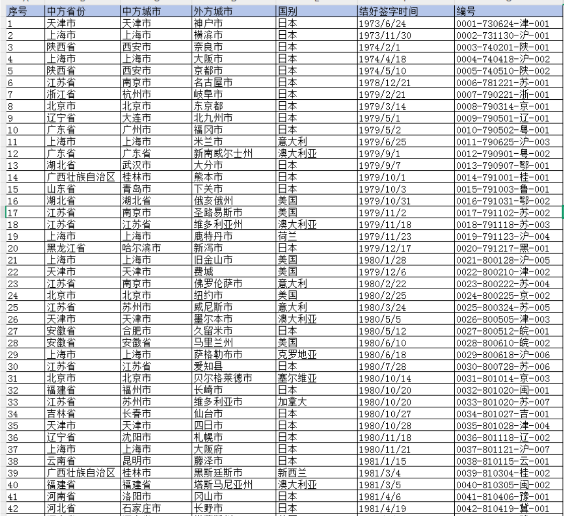 01、数据简介是中国各省级行政区、地级市等地方政府与外国地方政府(包括城市、省、州等)缔结友好关系的相关统计信息。这些数据记录了双方在平等互利基础上,通过签署正式协议建立的官方友好城市关系,涵盖结交时间、缔结城市、合作领域及后续互动等内容,是衡量中国地方对外交往规模与深度的重要指标。数据名称:中国与国外友好城市结交数据数据年份:1973-2025.102、相关数据序号、中方省份、中方城市、外方城市、国别、结好签字时间、编号03、