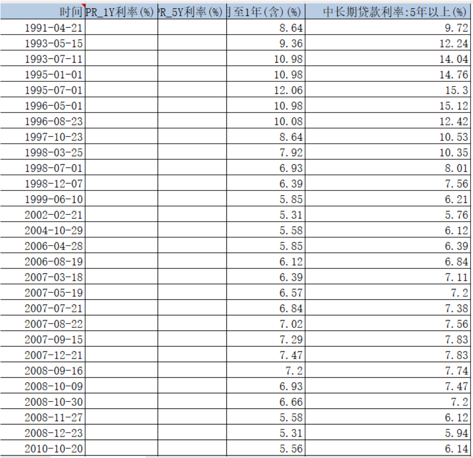 01、数据介绍LPR由各报价行根据其对最优质客户执行的贷款利率进行报价。这些报价行通常是由中国人民银行选定的大型商业银行,它们根据自身对最优客户的贷款利率情况,以加减点的方式进行报价。贷款市场报价利率LPR数据是一个由中国人民银行授权全国银行间同业拆借中心公布的基础性利率,用于指导银行贷款利率定价。它具有高度的市场化程度,能够反映信贷市场的资金供求情况,并对贷款利率和融资成本产生重要影响。数据名称:贷款市场报价利率LPR数据数据年份:1991-2024年数据来源:东方财富02、相关数据及指标时间、LPR_1Y利率(%)、LPR_5Y利率(%)、短期贷款利率:6个月至1年(含)(%)、中长期贷款利率:5年以上(%)。03、