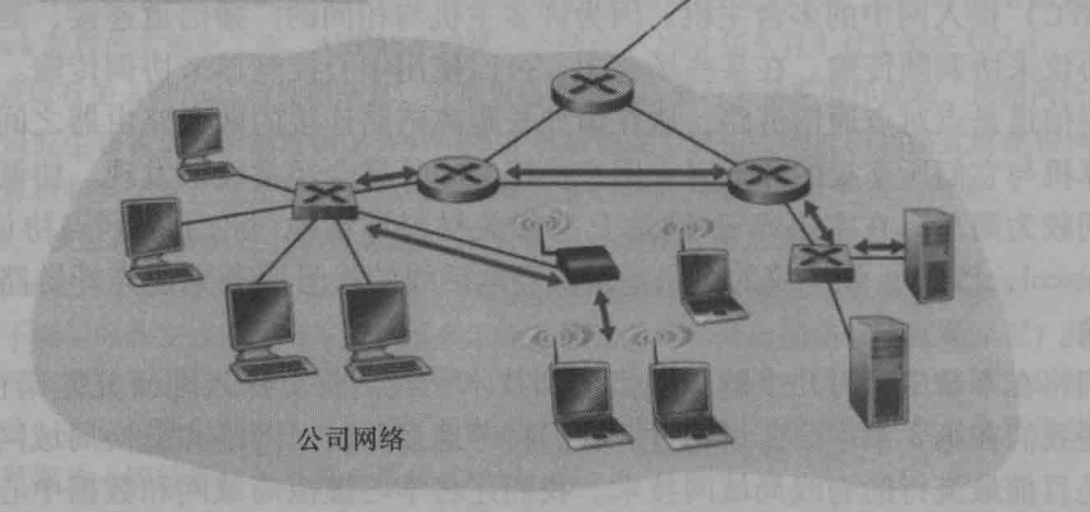 如上图所示的公司网络中,思考从无线主机向服务器发送一个数据报,该数据报将实际通过6段链路: