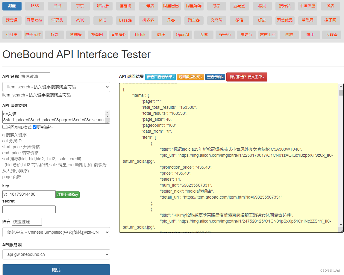 url = "https://api-gw.onebound.cn/taobao/item_search/?key=<您自己的apiKey>&secret=<您自己的apiSecret>&q=女装&start_price=0&end_price=0&page=1&cat=0&discount_only=&sort=&page_size=&seller_info=&nick=&ppath=&imgid=&filter="
