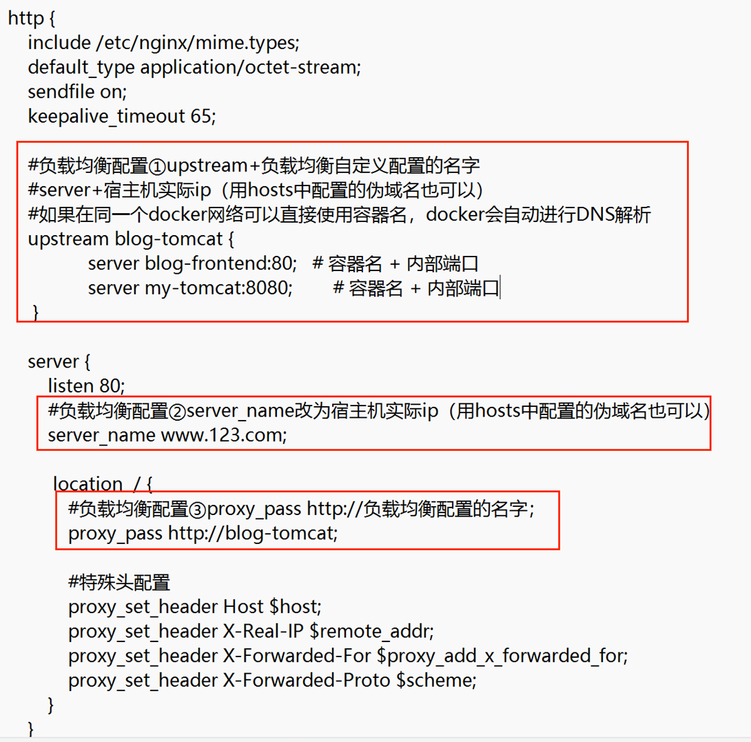 1、在server块上加入upstream+你自定义的负载均衡的名字以及server+容器名+内部端口