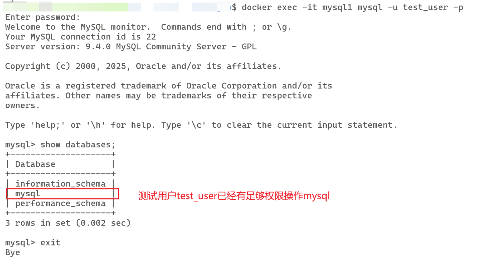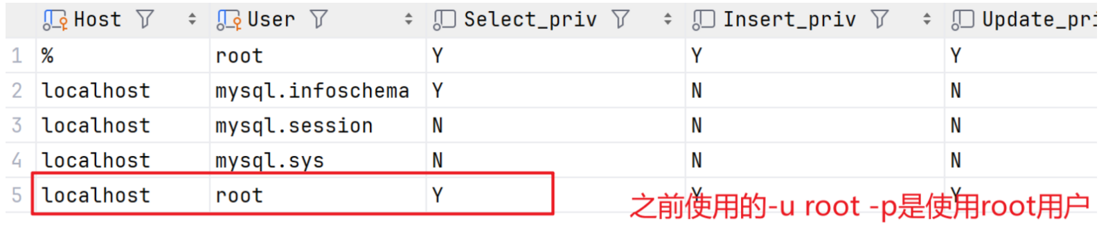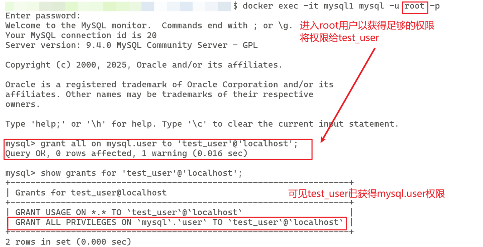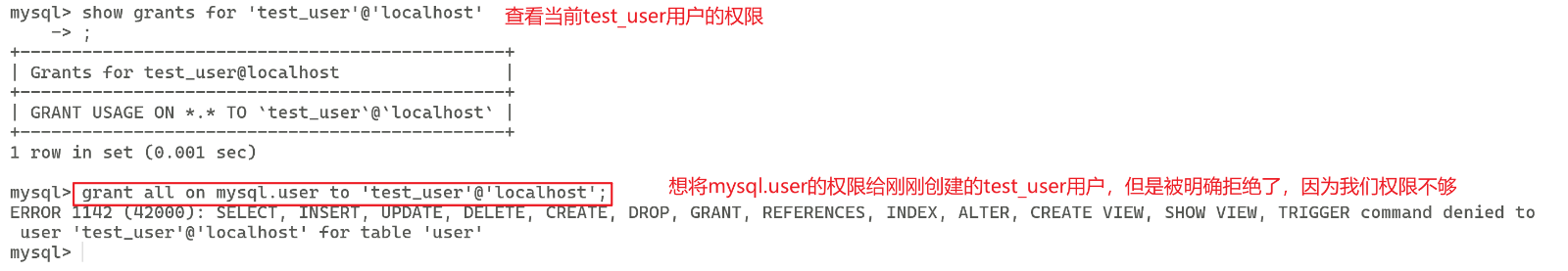 此处将对mysql数据库的user表的所有权限给了test_user(此处只是做演示,不建议真正这么做,mysql.user是系统表不建议给普通用户直接管理的权限)
