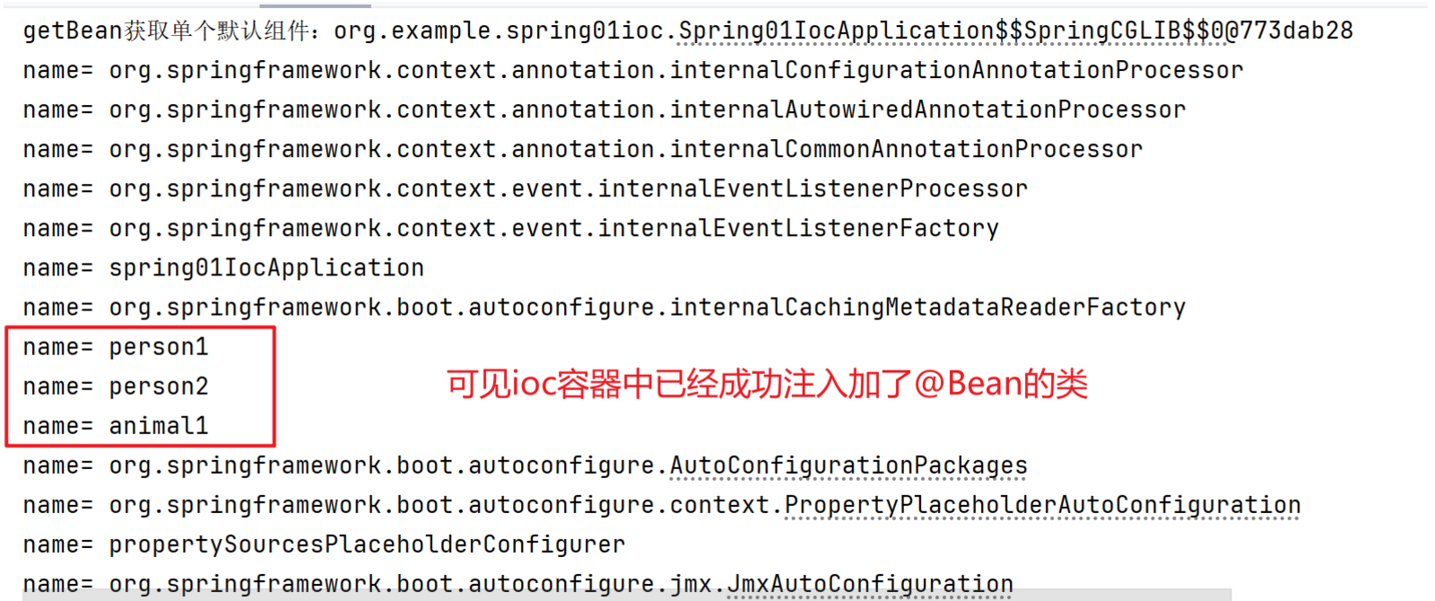 // Animal result2 = ioc.getBean(Animal.class); // 当容器中只有一个组件时可以直接按照组件类型获取组件