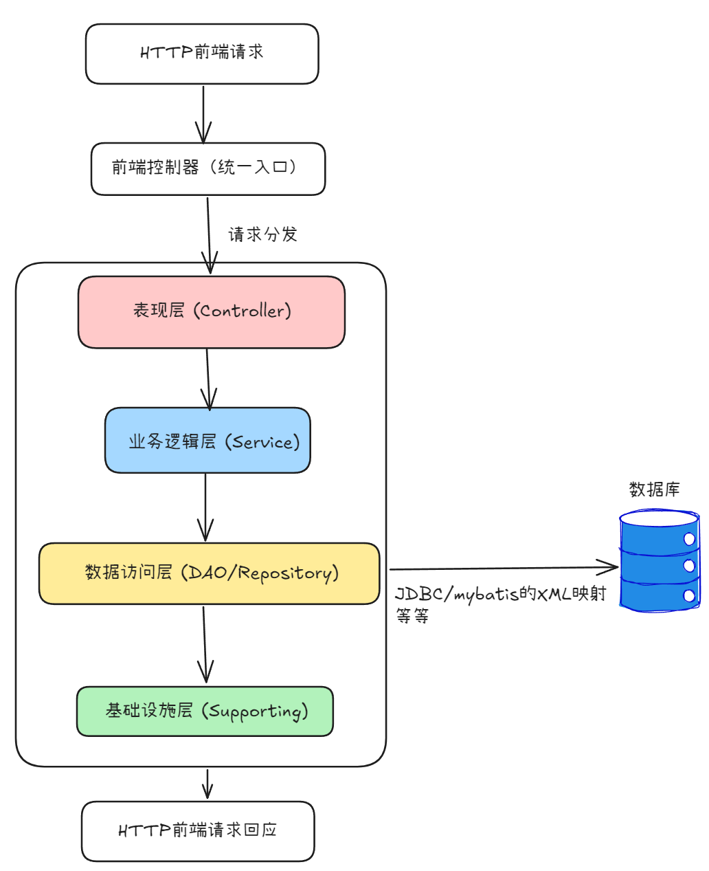 | 数据访问层 (持久层)DAO / Repository | 与数据库交互,CRUD | @Repository<br>MyBatis / JPA / Hibernate<br>Entity / Mapper / DataSource | 不出现任何 Web 类;SQL 只在这一层 |