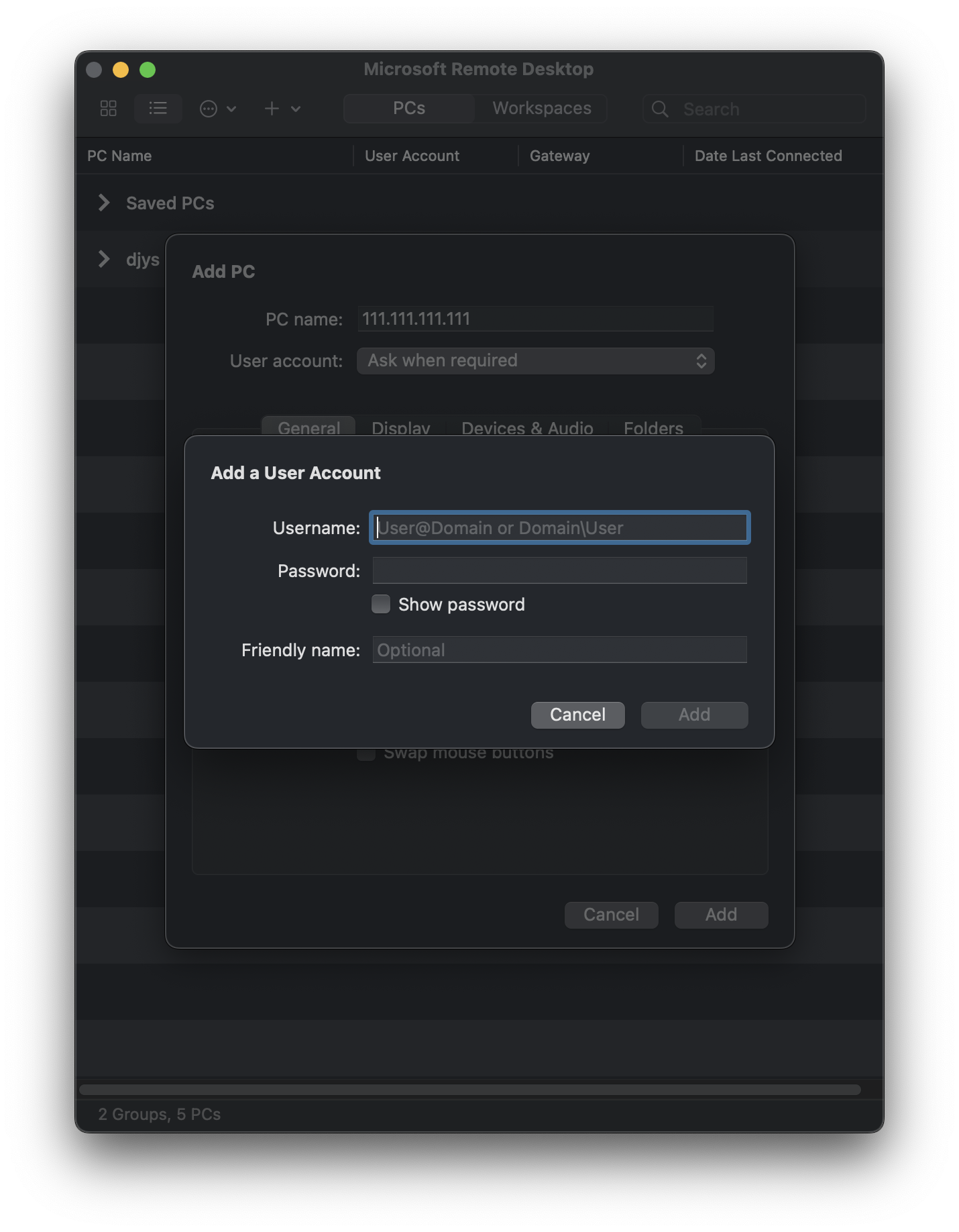 4、单击User account的下拉菜单,选择Add User Account...,在弹出的对话框中填写堡垒机的用户名和密码,完成后单击Add。