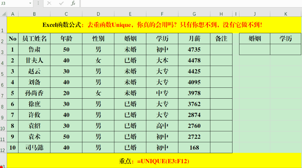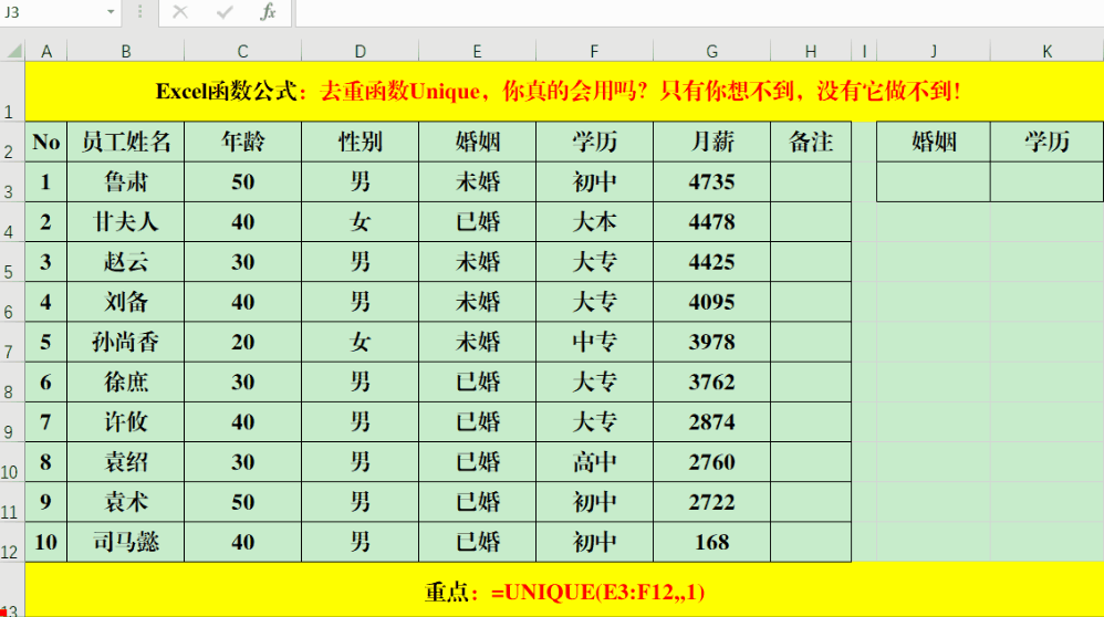 1、此公式是Unique函数简洁的公式,省略了“比较方式”和“返回范围”两个参数,即按照列进行比较,返回指定范围中所有的不重复值。