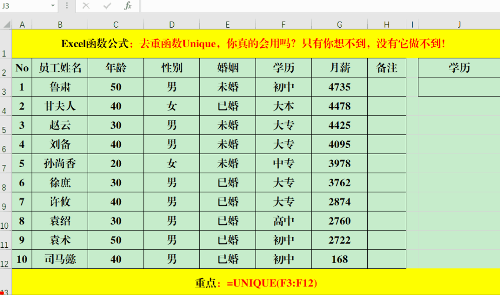 在目标单元格中输入公式:=UNIQUE(F3:F12)。