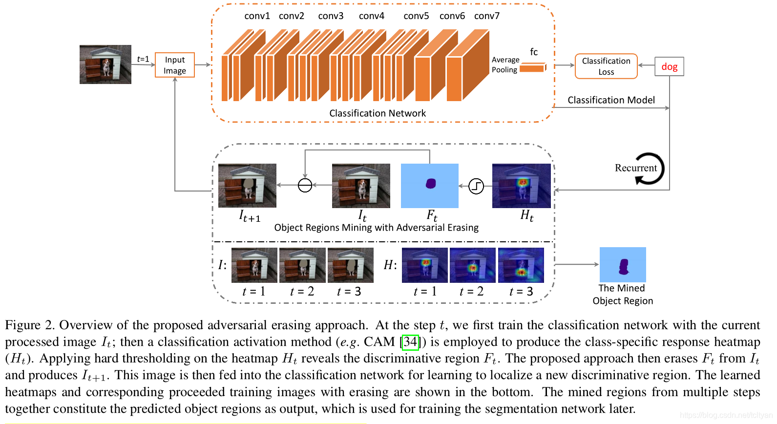 文章的motivation仍然是解决CAM网络仅对小面积且稀疏的显著区域产生响应的问题。作者注意到,既然CAM网络挖掘物体最显著区域的能力那么强,那么如果采用迭代的思想,将CAM网络每一次挖掘到的图片最显著区域擦除掉,再将擦除后的图片输入CAM网络,那么为了保持分类网络的准确性能,CAM网络将再次挖掘到其他的物体显著区域。作者认为,迭代地重复上述对抗擦除-显著区域挖掘的操作直至CAM网络的分类损失不再很好地收敛,合并历次的擦除区域将便能获得稠密且完整的像素级物体分割标签。