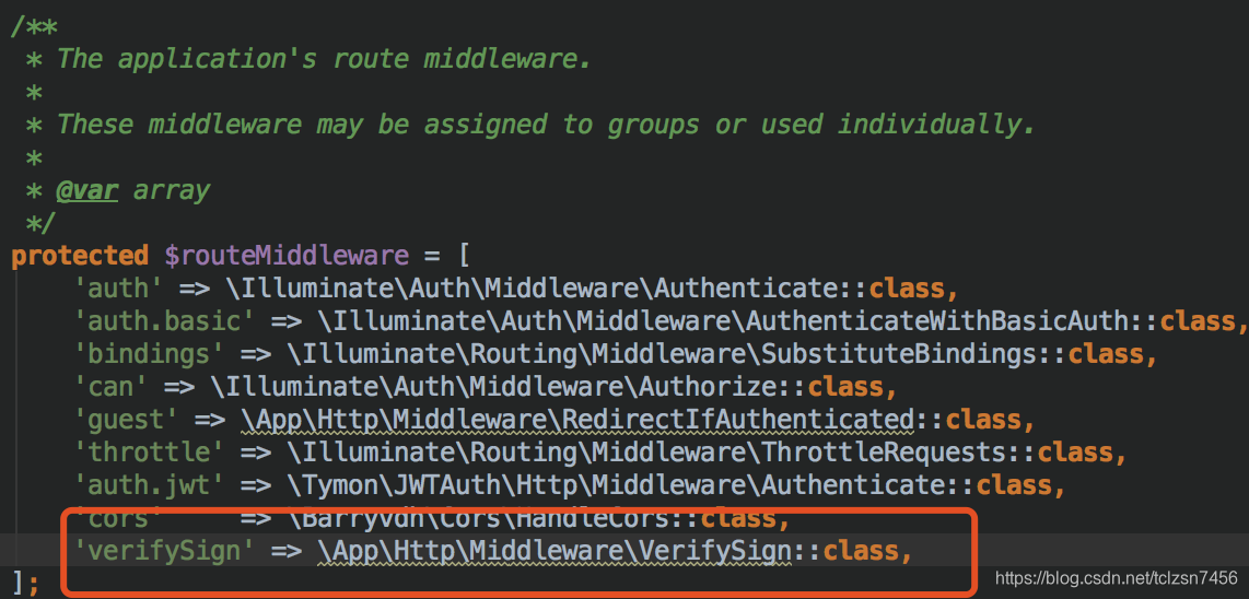 3.找到项目目录如下,打开Kernel.php,在$routeMiddleware中添加当前这个中间件的路径,并起一个名字,如verifySign