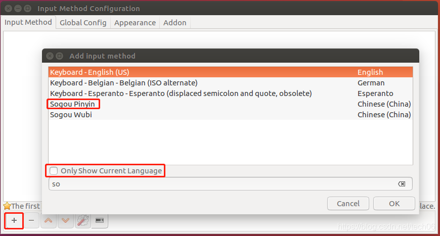 这时点击左下角的+就可以添加输入法了(如果还是空的可以重启再试一下),注意不要勾选Only show Current Language。