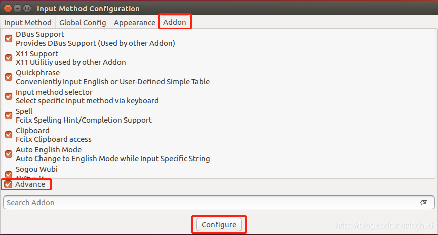 我们需要先切换到Addon选项卡,选择Advance,把列表里的组件都添加进来(注意DBus组件一定要勾选,否则Input Method一直是空的。建议选择全部勾选),然后点击Configure等待配置成功,然后关闭窗口,重新双击Fcitx Config Tool打开配置界面。