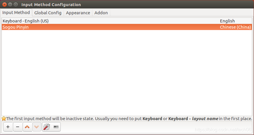 我们可以双击Fcitx Config Tool打开其配置界面,此时Input Method可能是空的,点击左下角的+也是空的。