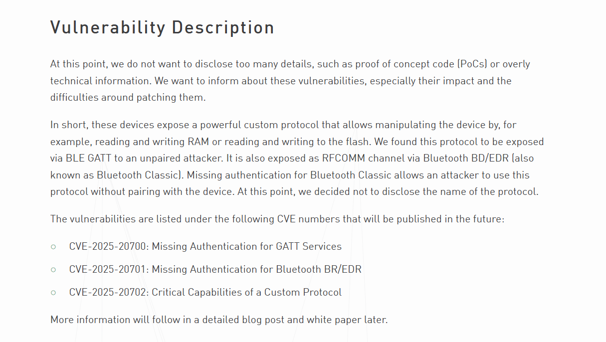 这三个漏洞最让人胆寒的是其间接赋予了攻击者绕过蓝牙认证流程的能力。这意味着,侵入者无需设备主人的许可,就能像拥有隐形钥匙一般,轻松连接至存在漏洞的设备。