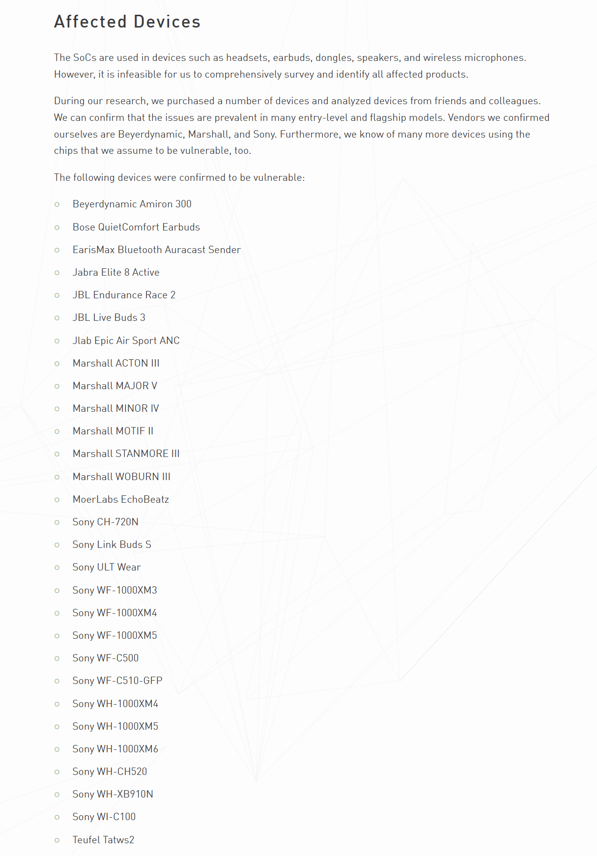 ERNW 发布的报告显示,此次的安全漏洞问题至少影响了知名品牌厂商出品的 29 款音频设备,其中不乏Sony、Marshall 等传统音频大厂。