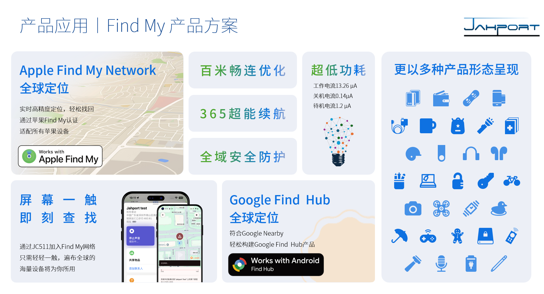 珈港科技JC511蓝牙芯片从性能、成本到应用等维度,全方位赋能Google Find Hub生态建设。 助力三方配件厂商快速构建Find Hub产品,借助Android庞大的用户基数与生态优势,实现产品的快速推广与市场拓展。