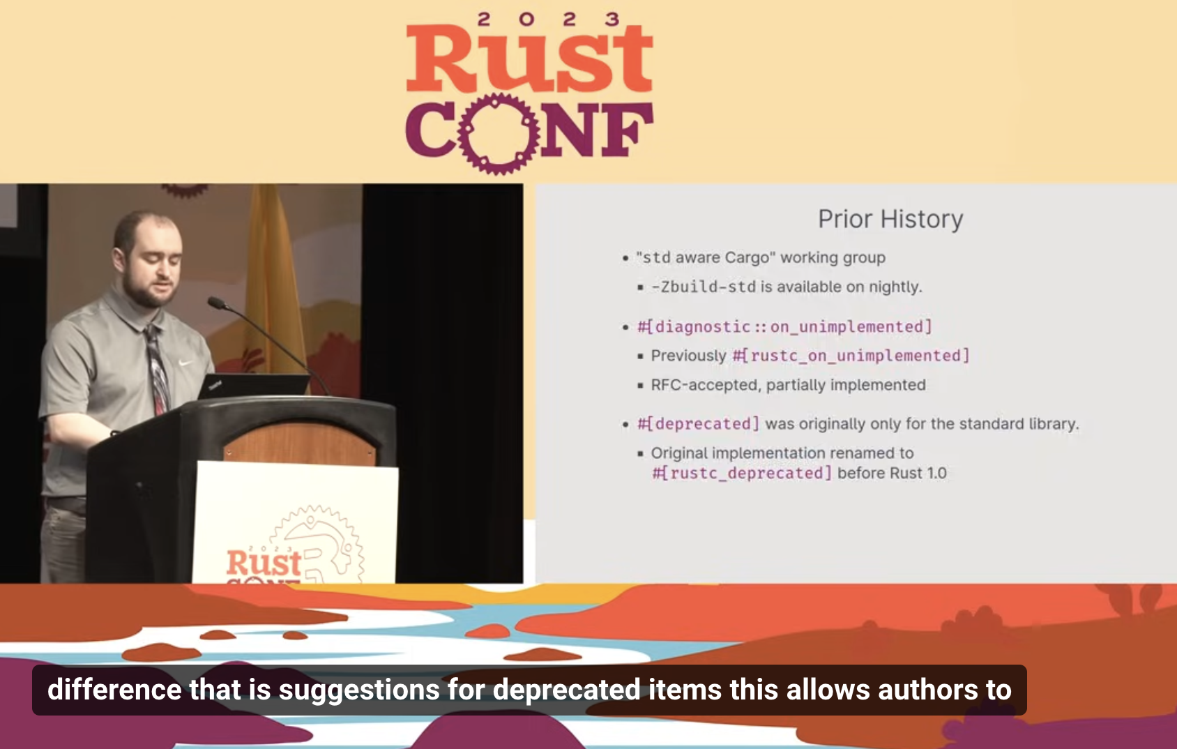 也许列表中最令人惊讶的是deprecated属性,它最初只用于标准库。它有一段很长的历史,始于Rust 1.0发布之前。原始实现被重命名为rust_c_deprecated,并只提供给标准库。引入了一个新的deprecated属性,它没有任何代码与rust_c_deprecated相同。