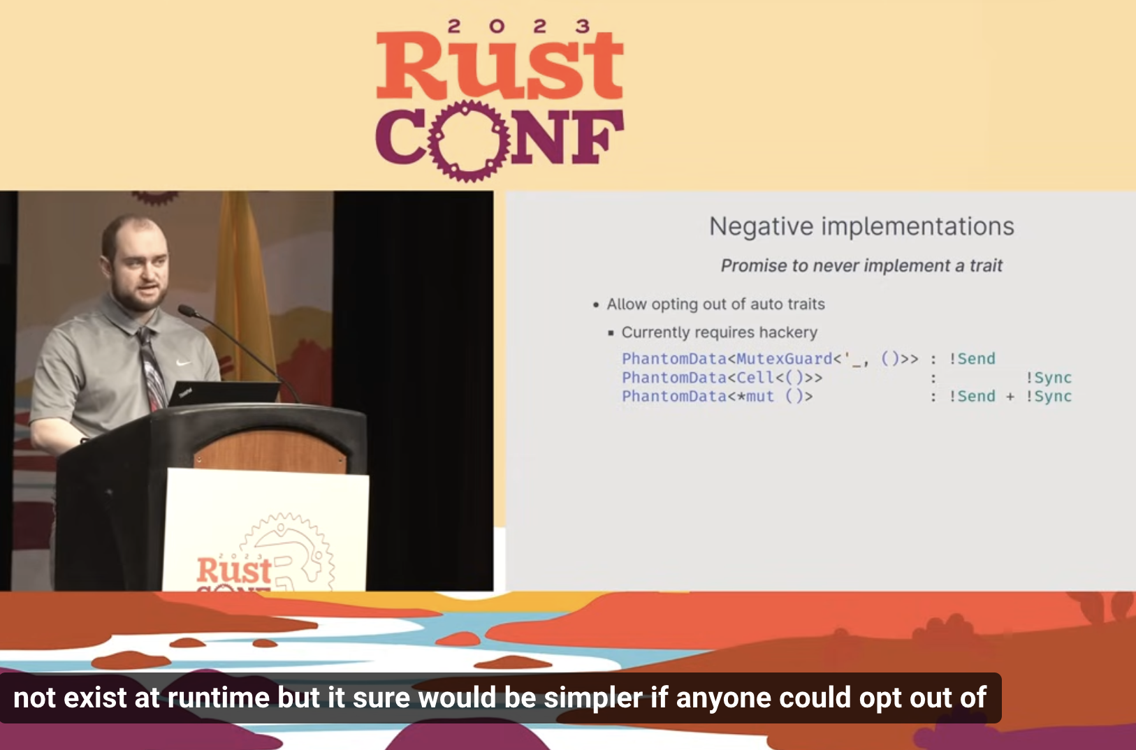 这在技术上是可能的,但这样做相当不符合人体工程学,因为它需要一些hack。这怎么可能呢?嗯,标准库包含有这些trait的负面实现的类型。具体来说,MutexGuard实现了!Send, Cell实现了!Sync,可变指针实现了!Send和!Sync。这很好,除了你可能想避免在内存中存储这些类型。相反,你可以将它们包装在PhantomData中,PhantomData在运行时不存在,但如果任何人都可以不使用这个hack就退出自动trait,那肯定会更简单。