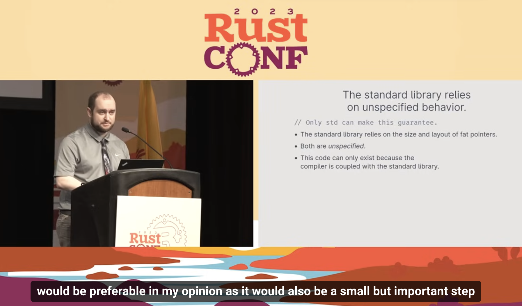 虽然胖指针的大小一直是usize类型大小的两倍,但据我所知,这并没有被正式保证。布局也是如此,它从未改变,但并没有得到保证。这段代码之所以能存在,只是因为编译器与标准库耦合。就标准库而言,它的代码在当前行为下工作,这就足够了。话虽如此,要让标准库变得不那么特殊,有两个选择。一是将胖指针变成一个语言项,这将确保它由编译器实现,从而保持同步。另一个选择当然是简单地保证胖指针的大小和布局。在我看来,这是更可取的,因为它也将是朝着稳定ABI迈出的一小步但却是重要的一步。