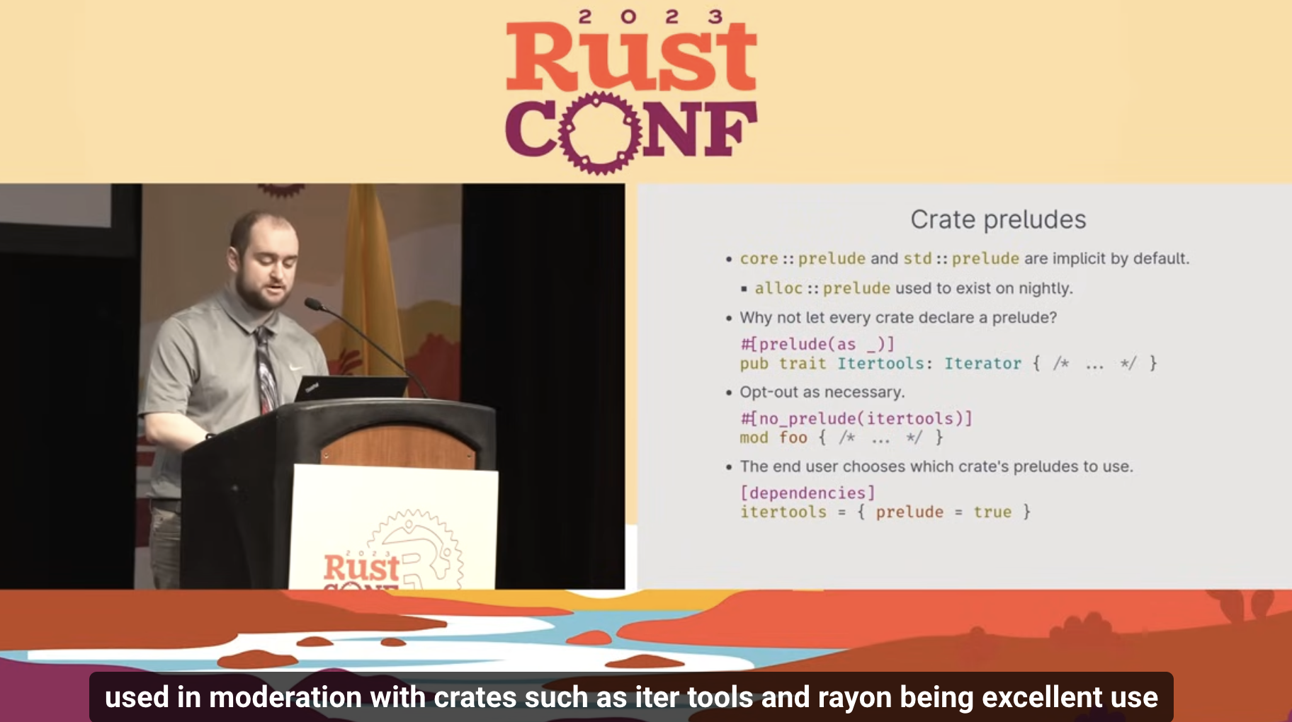 虽然自定义Prelude最初在2015年2月被提出,但这与那个提案有显著偏差。我相信crate Prelude在适度使用时会提供显著的好处,像itertools和rayon这样的crate是极好的用例。