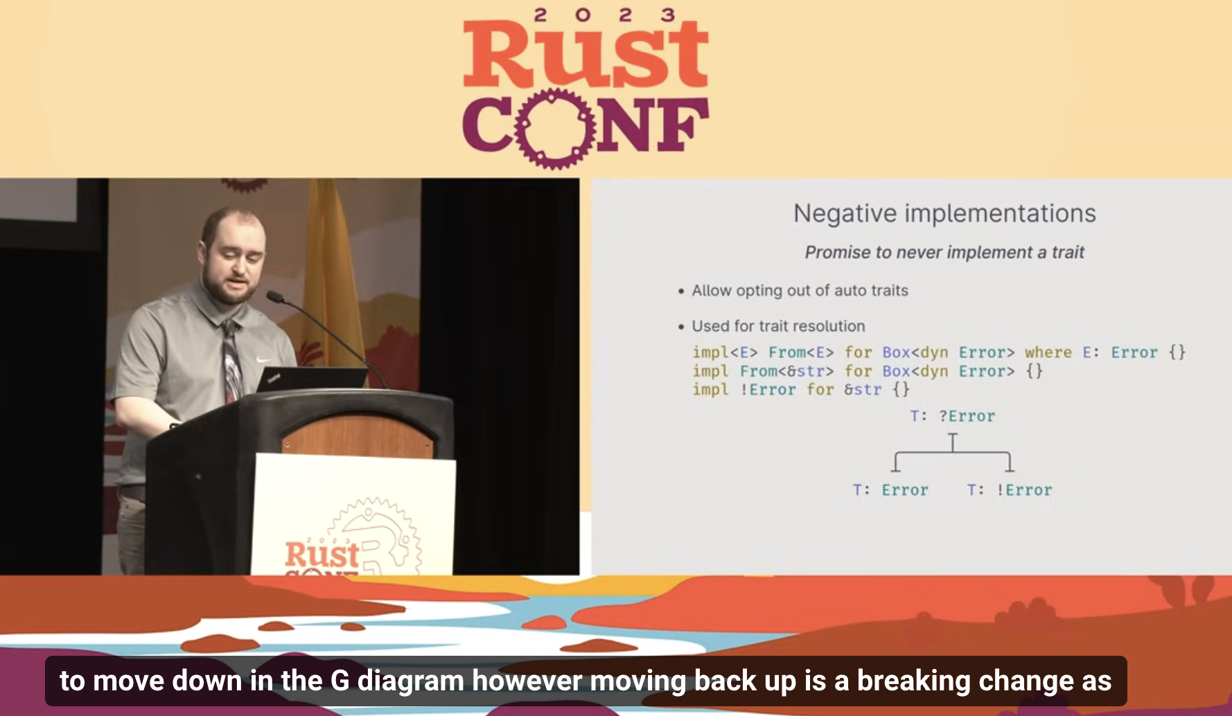例如,标准库有一个实现,允许任何错误类型转换为Box<dyn Error>。但如果我们也想为Box<dyn Error>实现From<String>呢?为此,我们需要一个图表。在顶部是可能实现Error的类型,无论是当前还是将来。左边是已经实现的类型,右边是永远不会实现的类型。所有类型都从图表的顶部开始,但作者可以选择向下移动到左边或右边。对所有Error类型的blanket实现考虑了所有可能实现Error的类型,无论它们当前是否实现。出于这个原因,第二行是被禁止的。String可能在将来实现Error。为了满足编译器中的重叠检查,我们必须明确承诺String永远不会实现Error。这样做,我们将String移到了图表的右侧,将它们从blanket实现中排除。