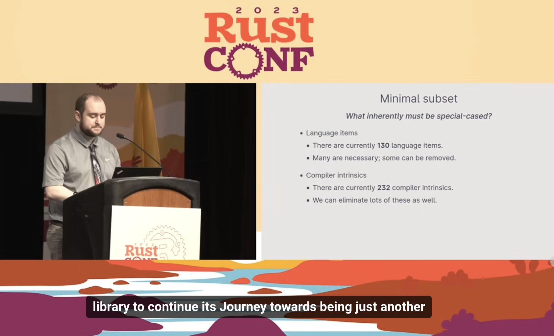 语言项和编译器内部函数构成了必须予以特殊处理的内在因素的主干。出于这个原因,它们的数量应该缩减到最低限度,并移到它自己的crate中,这个crate将保持特殊。这将允许标准库的其余部分继续成为另一个(普通)crate的旅程得以继续。